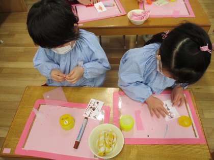 自然が大好きなもも組の子どもたちはかわいいお花をつくっているところです。どんなプレゼントになっていくのでしょう。みどり組さんが喜んでくれるといいな・・と心を込めてつくっています。
