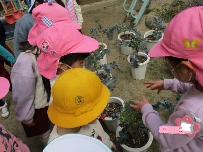あたたかい日が増えてきました。ブロッコリーの黄色いつぼみを見つけたり、枝の新芽を発見したりしているもも組の子どもたちです。