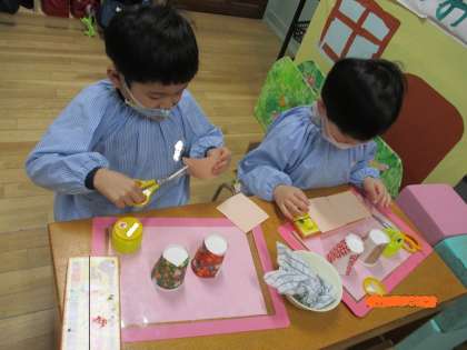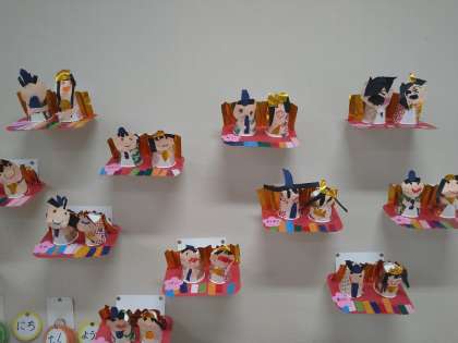 保育室では、紙コップに丁寧に紙を巻き、ひな人形もつくっています。幼稚園のひな人形を見てイメージがふくらんだようです。画用紙を小さく切り、細かいところも丁寧につくることができるようになってきましたね。一人一人とてもかわいいひな人形ができました。
