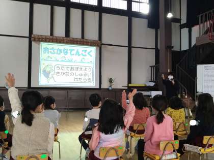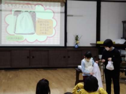 もうすぐ1年生になるみどり組は「魚」を例に食べ物の栄養や小学校の給食についてスライドを使って分かりやすく教えてもらいました。「おさかな天国」の歌の歌詞に出てくる魚の名前を言い合ったり、魚の栄養や働きについても集中して聞いていました。給食の時に着るエプロン、毎日飲む牛乳パックも見せてもらいました。エプロンをたたんでみたり「この穴にストローをさすんだな」と牛乳パック興味をもって見ていました。