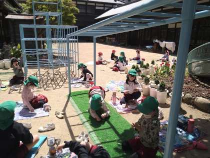 春季休業中、幼稚園では預かり保育に参加している子どもたちが、あたたかな日差しの中で元気に遊んでいます。園庭でピクニック気分でお弁当を食べている子どもたち。ポカポカあたたかくて気持ちがいいですね。