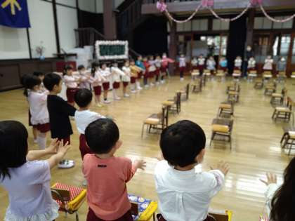 入園式前日、在園児たちは入園式で新しい友達が喜んでくれるようにとお祝いの演技のお稽古をしました。