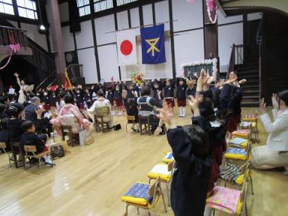 「在園児お祝いの言葉と歌」では、みどり組、もも組の子どもたちのお祝いの気持ちが溢れていました。「むすんでひらいて」の手遊びは、新しい友達も真似っこ。楽しそうでした。