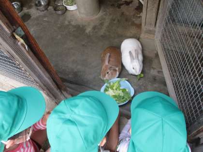 2羽のウサギ、ぴょんちゃん、ちょこちゃんは、子どもたちにご飯をもらって大喜び。