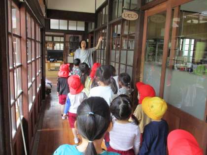 「一緒に手を繋いでいこうね」「このお部屋は遊戯室だよ」などと、優しく話しかけるみどり組。あか組の子どもたちは嬉しそうに探検していました。異年齢のこのような関わりも大切にしていきたいと思います。