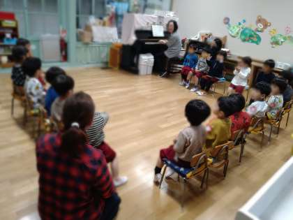 面白そう!と先生の話やピアノの音色に引きつけられ、ちょこんと自分の椅子に座っています。入園してから約半月。やりたい遊びを先生としたり、少しの間なら座って話を聞いたりできるようになってきました。