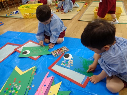 画用紙にパスでかいたり、好きなシールを貼ったりするのが面白く、喜んでこいのぼりもつくっています。