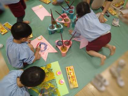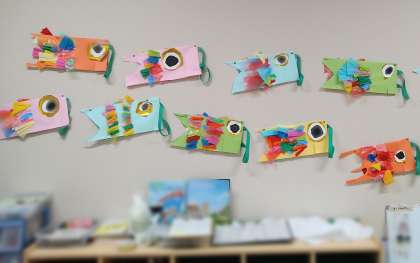 みどり組は、大きい目!うろこは沢山あるよ!と意欲的につくっています。うろこは両面テープを使いながら1枚1枚丁寧に貼っています。スズランテーブやクレープ紙は色合いを考えています。かわいいこいのぼりが増えてきています。