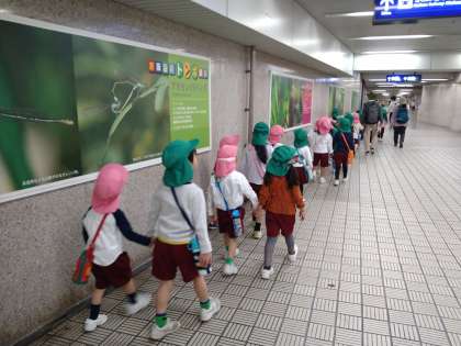 地下道や橋等バラ園までの道中、先生が声をかけると、みどり組の子どもたちは年下のもも組の友達が道の端を歩けるようにさっと左右を入れ替わっていました。バラ園まで安全に歩くことができました。