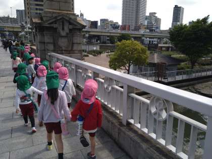 4月末、もも組・みどり組は「お散歩デー」で今年度初めて園外へ出かけました。今年度もしっかりと歩く経験を大事にしたいと思っています。
