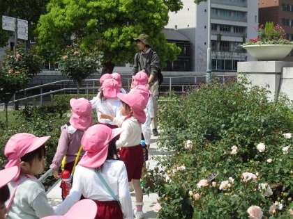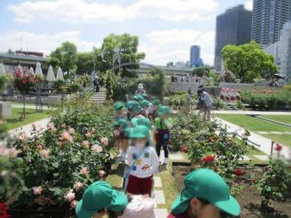 今度はあか組の友達も一緒に行きましょう。次に来た時は今よりたくさんのバラの花が咲いているでしょう。体を動かしたり、散策をしたりして次回への期待も高まったお散歩デーでした。