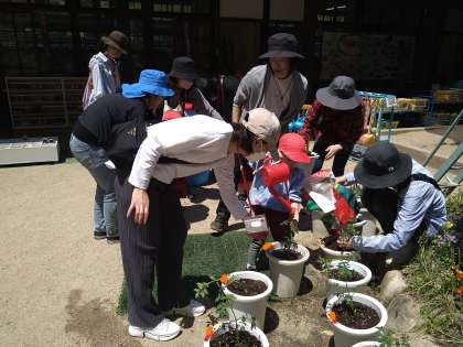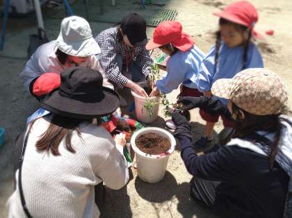 今週は、保護者の方と一緒に夏野菜の苗を植えました。鉢に土を入れ、その上にそっと野菜の苗を乗せ、ふんわりたっぷり土をかぶせていきます。あか組は、初めての苗植えに興味津々。嬉しそうに不思議そうに苗を見たり、土をさわったりしていました。どのクラスの子どもも保護者もふれあいを楽しみながら活動していました。