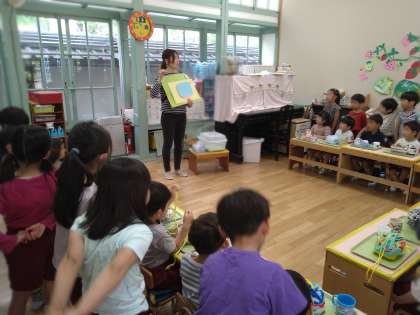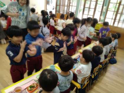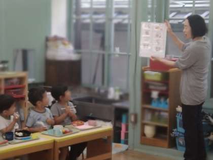 準備や片付けの仕方をかいたカードを見て、先生の話もよく聞いていました。これからお弁当を食べるのが楽しみですぬ。