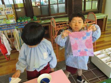 紙に絵具をしみ込ませる時もしみ込ませた紙を広げていく時も「どんなもようかな?!」とワクワクドキドキです。どの子どもも楽しみながら素敵な1枚をつくっていました。