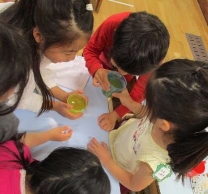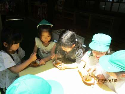 落ちていたり、収穫の際に傷が付いていたりしたキンカンは、ジュースにすることにしました。どんな道具が必要かを聞くと、色水遊びの経験などから、すりばちとすりこぎ、ザルやボウルなどの名前が出てきました。その道具を使ってキンカンを潰し、少し水を入れて更にキンカンを潰して混ぜるといい匂いのキンカンジュースができました。