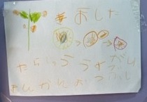 その後、気付いたことを絵や言葉で表現している子どももいました。右の絵には「きんかんをつぶしたらじゅうすができました」とかいています。楽しかったんですね。