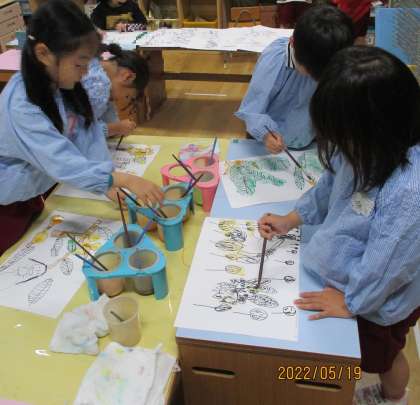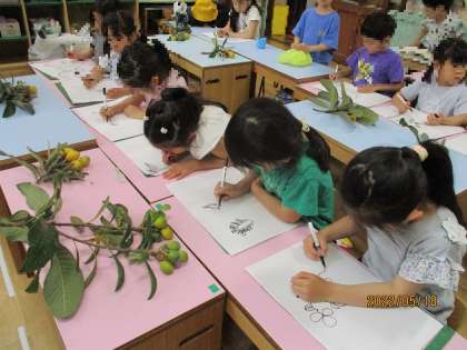 ビワを収穫した際にはじっくっりと観察し、サインペンで絵をかきました。ビワを観察しながら、ゆっくりと細かなところまで工夫してかいていました。翌日には、葉の色やビワの色を、丁寧に絵の具で色付けし、できた時には嬉しそうな表情の子どもたちでした。