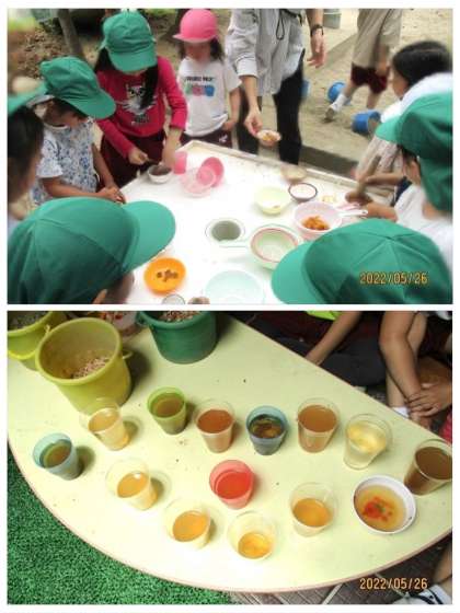 キンカンジュースをつくった経験から、傷が付いているビワを使って「ビワのジュース」つくりをはじめる子どもたちもいました。潰したり混ぜたり、ザルを使って果汁と皮、種を分けるなど工夫しながらつくっていました。濃さやつくり方の違いに気付いて知らせ合う姿が見られました。甘いにおいのジュースがたくさんできました。