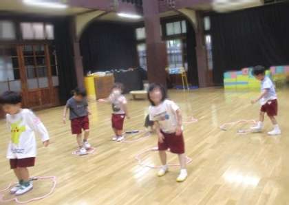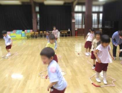 アイデアいっぱいのもも組は、興味をもった絵本にでてくる「おうち」を短縄でつくっていました。縄でつくった自分のおうちと友達のおうちを行ったり来たり・・・。走ったり止まったすることを楽しみながら体を動かして遊んでいました。