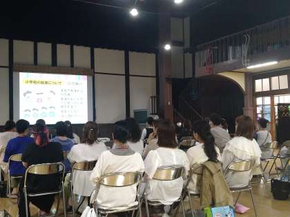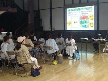 6月2日、近隣の開平小学校の栄養教諭の先生にお越しいただき、保護者対象に食に関する講話を開催しました。1日に摂りたい野菜の量、主食・副食・副菜の望ましい比率などを図や写真を用いて分かりやすく教えていただきました。たくさんの保護者が参加し、熱心に先生の話を聞いておられました。