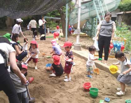 後半には雨がやみ、園庭で遊ぶことができました。砂場は人気でたくさんのお友達がいました。