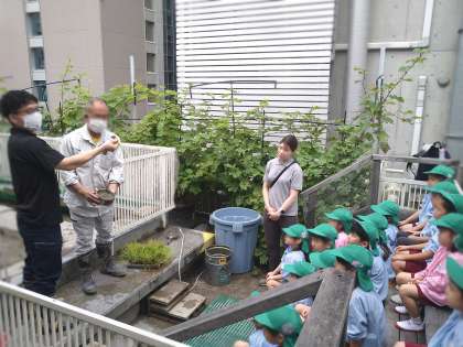 今年も地域の方のご厚意で、みどり組が向えの緒方ビルの屋上で田植えをしました。