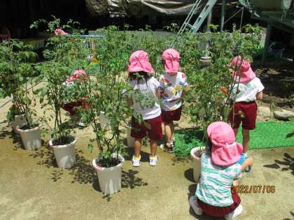 天気のいい日が続き、幼稚園の自然物がどんどん生長しています。ピーマン、ナスビ、ミニトマトやゴーヤ、キュウリ、オクラなどの夏野菜、北門を入ってすぐのプランターではアサガオがツルを伸ばし、大きな花を咲かせています。登園したあとすぐに、「今日は2つ咲いてた!」ともも組の子どもが元気に教えてくれます。また、自分が育てている夏野菜だけでなく、友達が育てている野菜、みんなの花にも水やりをすることで、自然物の生長や収穫の喜び、周りの人への思いやりの気持ちが育まれています。