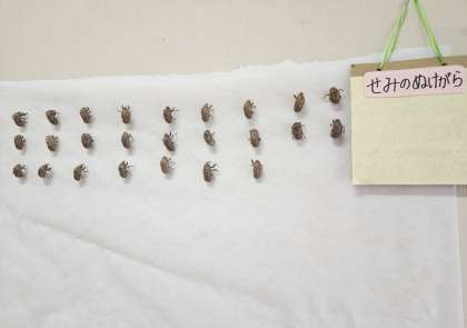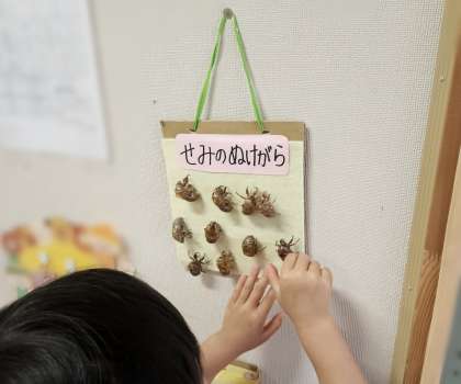 見つけたよ! 公開日 2023/07/14 更新日 2023/07/14 お知らせ 最近、「見つけたよ!」とセミの脱け殻を持ってくる子どもが増えてきています。 朝には元気なセミの鳴き声がきかれ、夏本場を知らせてくれています。 脱け殻をひっかけるボードを目につくところにかけておくと、みんなの目にとまり、1、2、3・・と数えたり、手にとって不思議そうに見たりしています。。 そろそろ小さいボードはいっぱいです。大きな布を用意しました。脱け殻、まだまだ増えてきそうです。 いいね(0)