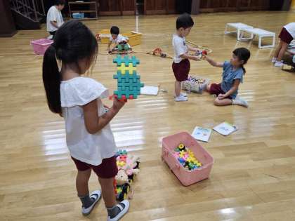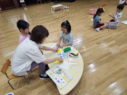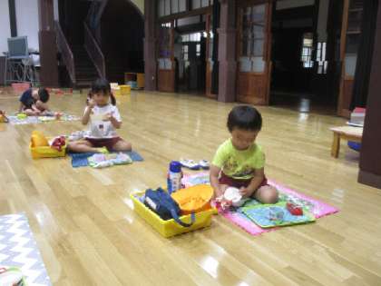 この日は、ブロックや積み木、お絵かきやおりがみなど、室内でいろいろな遊びをじっくりと楽しんでいました。異年齢の関わりもよい刺激になっています。