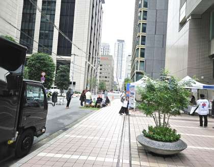 会場となった淀屋橋センタービル JAセンタービル 公開空地前面道路は、期間中高麗橋オープンストレート2023としていろいろなブース、キッチンカーも来ていて人々が自由に行き交える素敵な空間になっていました。参加したご家族はサポートしてくれる大学生に教わりながら、布からできた土を使った寄せ植え体験を楽しみ、SDGsも実感。