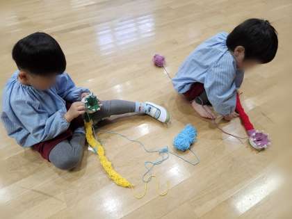画用紙を切り抜き、色の組み合わせを工夫しながらセロファンを貼ってステンドグラスもつくりました。光があたるとセロファンの美しい色がとても素敵です。編み物にも取り組みました。できあがりを楽しみに、時間をかけて一目一目編んで、自分だけのマフラーを完成させました。