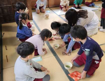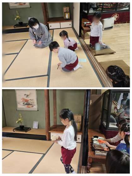 お茶の先生や保護者の方に茶碗の持ち方やふくさの使い方を教えていただくと、思い出して落ち着いて運んでいました。