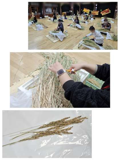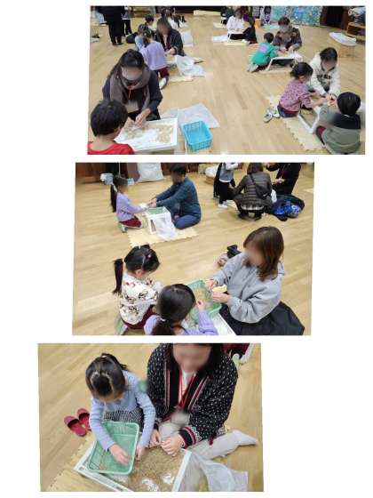 地域の方のご協力のもと育てて稲刈りをした稲は、毎年、みどり組の子どもたちが、稲穂取りから脱穀、精米の行程を体験します。この日は保護者の方がその準備をしてくださいました。天日干しして乾燥した稲穂を短く切り、籠の小さな穴に通すと、パラパラと1粒ずつの籾付の米になります。