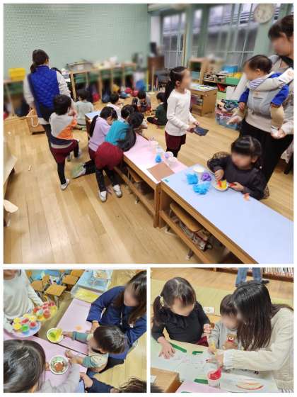 みどり組がレストランを開いて小さいお友達を招待しました。喜んでもらおうと、ご馳走にデザート、美味しいジュースといろいろな物をつくって運んだり、メニューの説明をしたりと大忙しでした。隣の部屋では、寄り添い、声をかけながら絵をかく手伝いをする優しい姿も見られました。