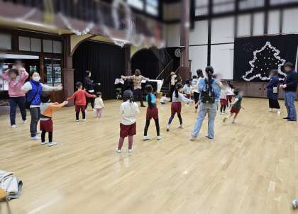 遊戯室では今歌っている歌を披露しました。「気持ちがこもっていました」「綺麗な歌声でした」と嬉しい感想をもらい、みどり組はにっこり笑顔。一緒にした「らーめんたいそう」はおもしろい動きをみんなで楽しみ体を動かしました。小さいお友達が喜んでくれてよかったですね。