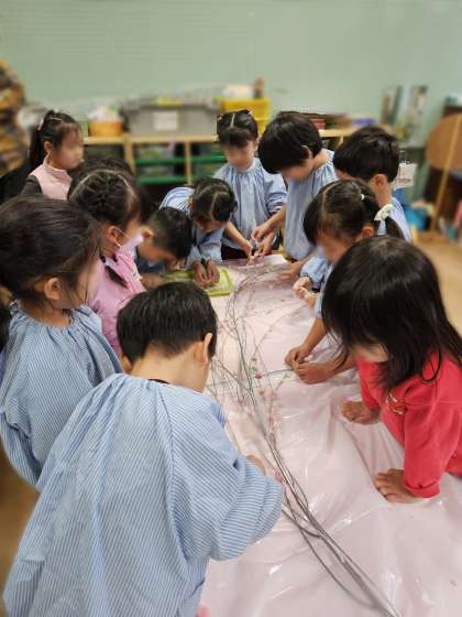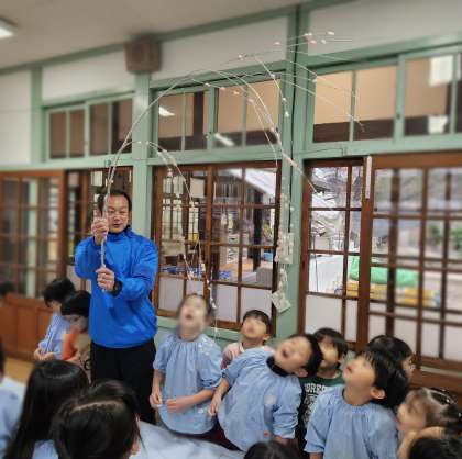 紅・白おめでたい2色の餅を小さくちぎって、ヤナギの枝につけていきます。みどり組が協力して何本もつくりました。自分たちでつくったもち花に大感動の子どもたちでした。
