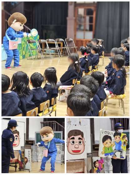 大阪府警察本部、東警察署の方々にお越しいただき、子どもたちに「防犯指導」を実施しました。子どもたちは、警察の方や着ぐるみ「ゆうかい するぞう」から、命を守るための大切な話を聞いたり、モンタージュ作成に協力しました。楽しい劇の中で大切なことを沢山教わりました。