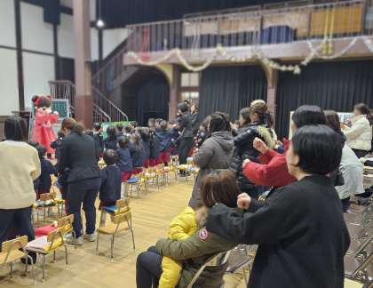 後半には、警察からかわいいアイちゃんという友達も登場!アイちゃんから教わった「ついていかない体操」は子どもも保護者も一緒に楽しみ、安全への意識を高めました。冬休み中も安全に楽しく過ごせるように、防犯対策、安全管理等の再確認をしましょう。