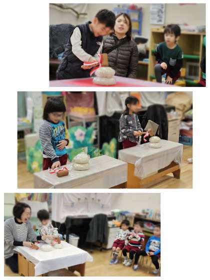 今年1年の健康と幸せを願いました。「みんなが健康でありますように」「小学校でも友達ができますように」・・・と、一人一人が願いごとを唱えながら木槌でトントン!トントン!と鏡餅を叩きました。災害がなく平和を願ったお願いもありました。