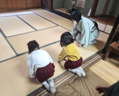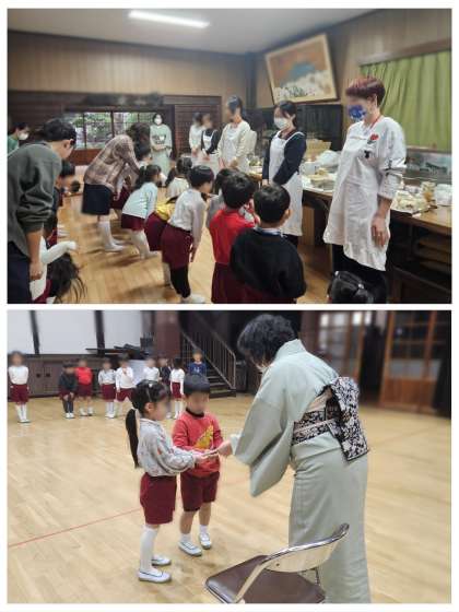 前回に引き続き、みどり組ともも組が一緒にお茶席に入りました。みどり組は「こぼさないように気を付けてね」「ここに置くんだよ」と優しくサポートしていました。もも組はみどり組にいろいろと教わったことで、今回の安心して嬉しそうに参加していました。来年度のお茶遊びに期待がもてそうです。