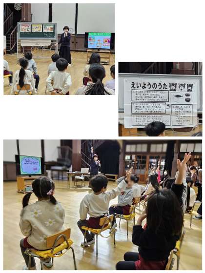 食べ物の歌を教えてくださったり、給食クイズもあったりと楽しい時間でした。いろいろなものを食べるとよいこと、給食を楽しみにする気持ちが高まりました。幼稚園の子どもたちに工夫したお話をありがとうございました。