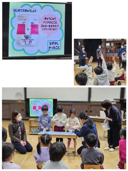 先日給食見学をしたことから、小学校での給食を楽しみにしている子どもたちは、大月先生が読み聞かせてくださった3匹のクマのお話、話の中にでてきた3大栄養素について大変興味をもっていました。苦手な食べ物はそれぞれあるようですが、もっと元気で丈夫なになるようにチャレンジしよう!と食への意識を高めていました。持ってきてくださった牛乳パックにストローをさす体験もしました。早くやってみたいですね。