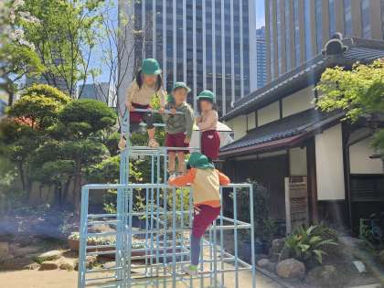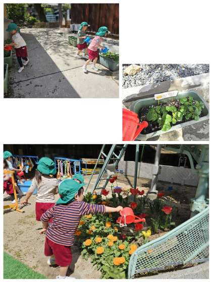 天気がよく、ジャングルジムに登るとまわりのビルがよく見えます。外の様子を眺めてご機嫌の子どもや水やりを楽しんでいる子どももいます。みんなで植えた種イモからは芽が出て、たくさんの葉をつけ伸びてきました。
