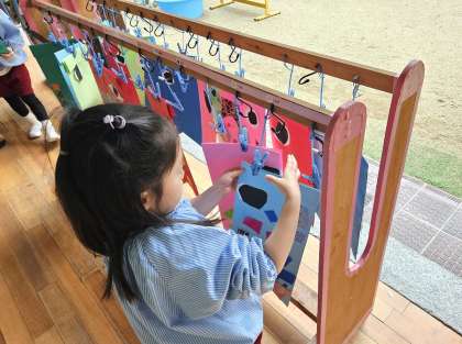 もも組では折紙や画用紙、カラフルな模造紙といろいろな紙を自分で切り、鱗にしていました。切った紙の大きさや形、組み合わせ等、一人一人の個性がキラリと光っています。
