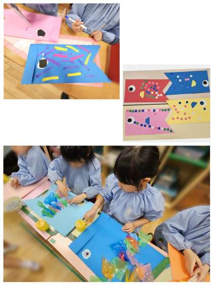降園時には保護者やごきょうだいとも眺めています。こいのぼりや五月人形を見たり、遊びに取り入れたりすることは、この時期の伝統文化に親しむよい機会になっています。