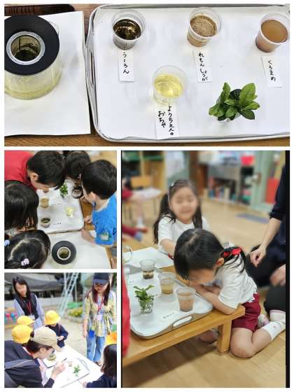 お湯を入れたら本当にお茶ができるのかな?と半信半疑でしたが、湯を注いで湯の色が変わり始めると「お茶の色や」「絶対お茶ができる!」と好奇心がわいてきました。できあがりがを見たり匂ったりしてお茶ができたことを実感していました。みどり組のお茶づくりは大成功!他の種類のお茶の香りや色にも興味をもっていました。