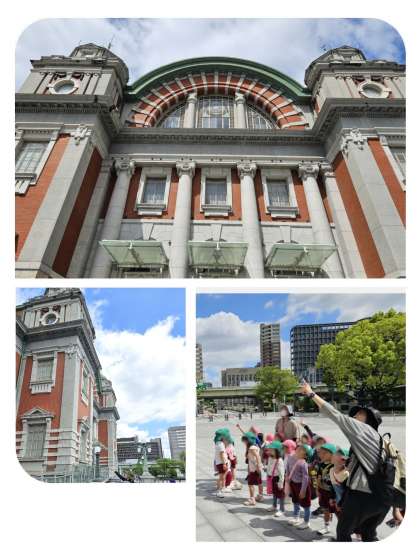交通量の多い信号を渡り、栴檀の木橋を渡っていると目の前に中央公会堂が見えてきました。どんどん近づいていくと、見上げてその外観の美しさや雅さ、迫力に目を輝かせていました。
