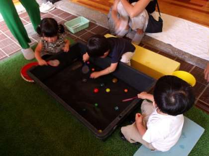 たくさんのお友達が遊びに来てくれました。軒下では、水に浮かぶキラキラしたフルーツやスーパーボールを上手にすくって遊んでいましたね。室内では、ままごとやお絵かきなど好きなことを見つけて楽しんでいました。