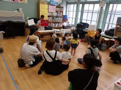 園長先生の紙芝居では、「おおきくおおきくなーれ」とみんなで声を合わせると、紙芝居に出てくるブタやタマゴが大きくなって大喜び!ケーキも大きくなって美味しそうにパクパク!ニコニコ笑顔で紙芝居を楽しんでいました。