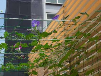 登園してくると「アサガオ咲いてるよ」「青の花がかわいいね」などと、見上げています。明日は幾つ咲いているかな・・・。